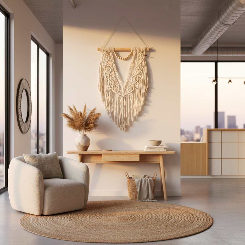 Painel Decorativo de Parede, feito à mão em Portugal, com técnicas de macramé, estilo boho.